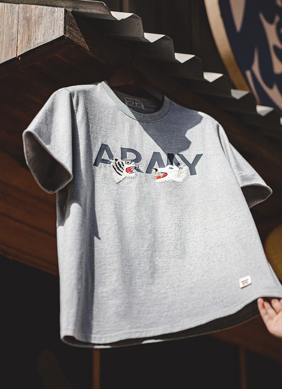 力強く精悍な印象を与えるウルフとタイガーヘッドが刺繍された、男らしいTシャツです。ガッツリとした生地感は丈夫で、長く着用してもよれず、型崩れしません。ビターでシャープなデザインは、カジュアルスタイルの定番アイテムとして大活躍します。